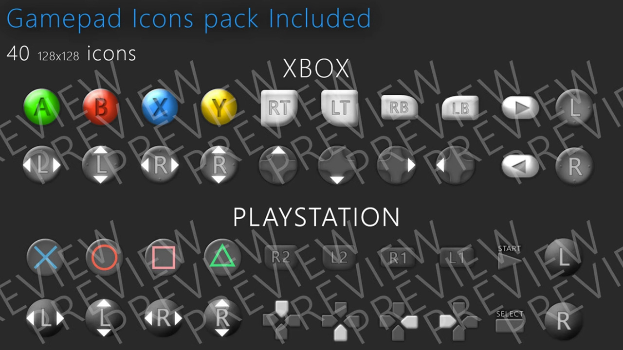 除了系统本身之外,此包还包含一些奖励。包包含 40 个游戏手柄(PS 和 XBOX)图标,分辨率为 128×128。当然,您可以在此系统或您自己的系统中使用它们。