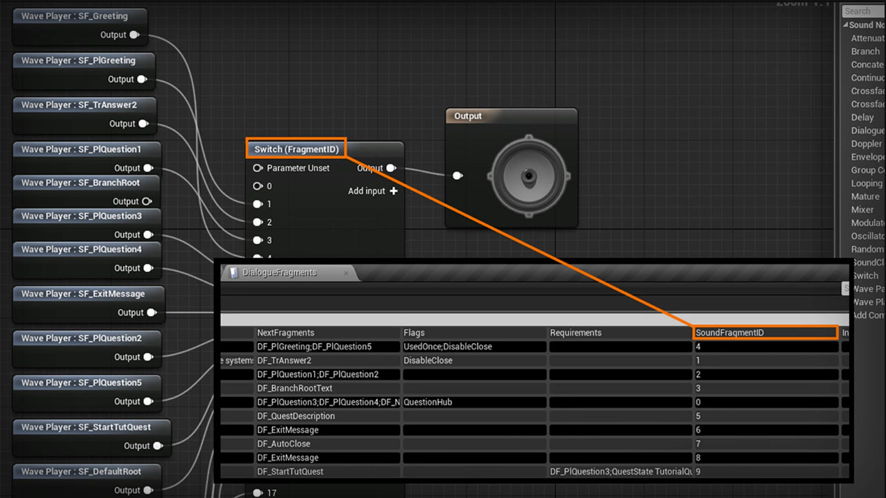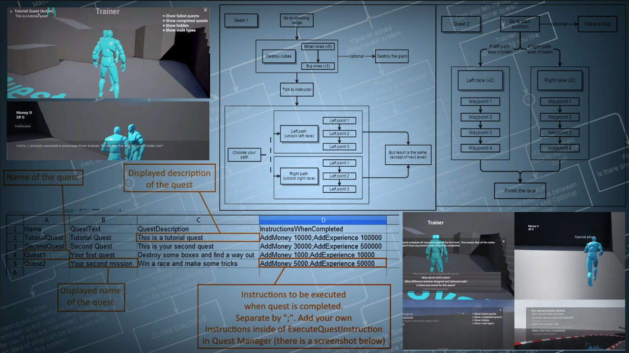 非线性蓝图查询系统和分支对话系统。所有的工作都来自两个主要的蓝图:任务管理器和对话管理器。任务的所有数据存储在两个CSV文件中,对话的所有数据存储在另外两个CSV表中。不同类型的任务节点可以实现任何任务流,甚至是高度非线性的。在这个节点可用之前,节点可以要求其他节点完成(甚至在其他任务中)。您还可以创建自己的指令,以便在节点完成时调用。指令由一个名称和任意数量的参数(您将它们写入CSV文件)组成两个可用的节点标志(甚至可以将两者都设置为一个节点):可选和重复。将来可能会有更多这样的人。所有的事情都只处理事件,所以不会影响性能的每一个滴答,只有当你更新任务。同时,我也在不断地寻找方法来优化它。对话是由片段组成的。每个片段可以有自己的需求(您可以添加自己的需求类型)。很少有任务标志可以支持不同的片段逻辑。对话也有类似于任务的教学语言。最后,你可以用这个系统进行非常复杂的对话。